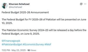 He further stated that the much-anticipated Pakistan Economic Survey 2024–25—a detailed review of the country’s economic performance over the past year—will be released on June 9, 2025, just one day before the budget presentation.